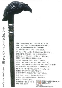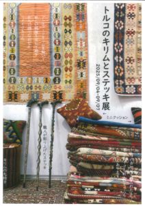 トルコの伝統毛織物キリムとステッキの展示即売会 キリムはトルコからアジアにかけての遊牧民に代々受け継がれてきた、毛足のない織物のことです。 アンティークやオールド等、年代物のキリムが多数あります。 部族の織りあげた希少なトライバルラグもあります。 また、お手頃なバックやクッション・玄関マット・壁掛け等、種類もサイズも豊富に取り揃えていて、 大きなキリムは10畳サイズ、何処にでも敷ける人気の1畳や1畳半サイズは沢山ご用意しております。 今回は、トルコ北東部に古くから伝わる手彫りのステッキも登場! トルコに自生する西洋グミの木をしっかり乾燥させた後、職人が一本一本手彫りで仕上げます。 キリムのように、模様も多彩でそれぞれに意味があります。 手作りですので、同じものがないキリムやステッキ。 お気に入りの1点ものをぜひ探してみてください。